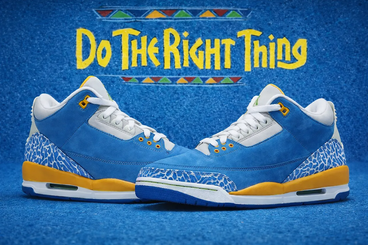 Retour en 2007. Jordan Brand sort une édition qui s’inspire directement de l’affiche du film de Spike Lee, Do the Right Thing, tourné en 1989 à Brooklyn. Bleu ciel. Jaune orangé. Touches de vert. Une palette qui tranche avec les coloris classiques de la silhouette. Mais ce qui retient vraiment l’attention, c’est le matériau. Pour la première fois sur une Air Jordan 3, le nubuck remplace le cuir sur la tige. Une décision audacieuse, qui n’a pas convaincu tout le monde au moment du lancement.