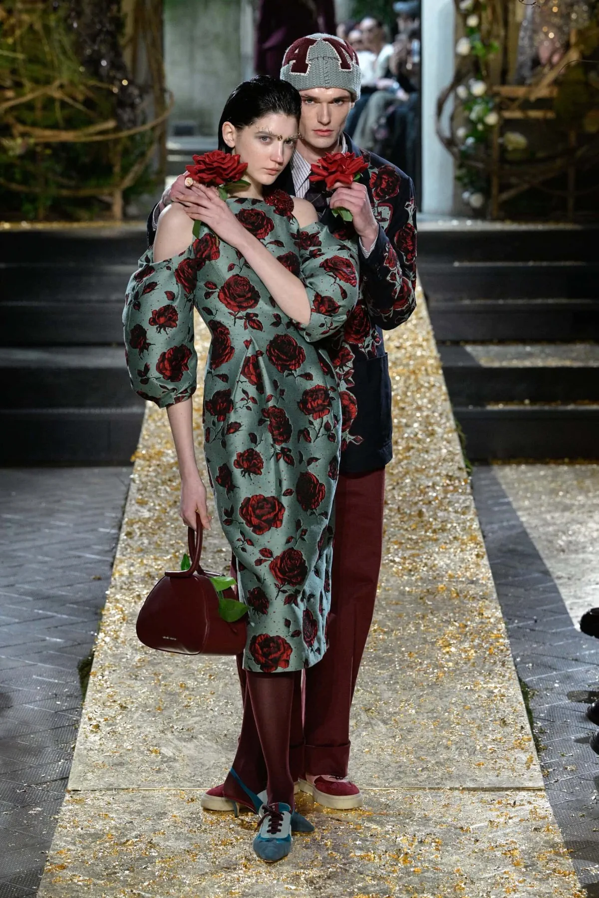 Cinquante silhouettes au lieu d’une centaine. Sur le podium, une allée d’or en feuilles. Autour des colonnes, des rosiers grimpants lourds de fleurs. Le décor dit tout. La rose n’est pas un ornement convenu ici. Elle est le fil conducteur d’un défilé pensé autour de la sensualité, de la lenteur et d’une certaine idée du romantisme masculin.