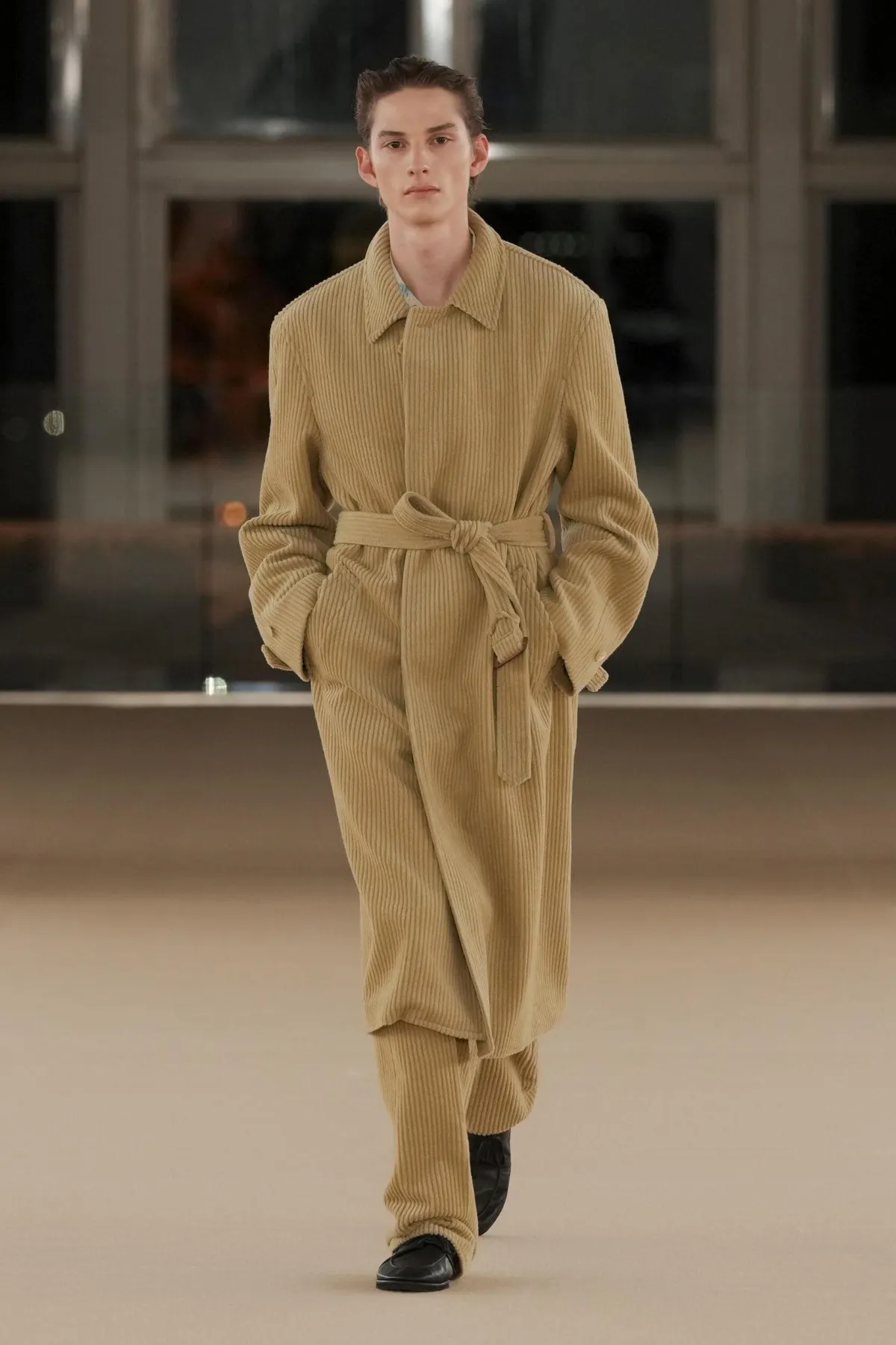 Le premier passage en dit long. Un trench couleur mastic descend le podium. Il pourrait s’agir d’un velours côtelé classique, mais Iwai a remplacé le coton ou la laine traditionnels par du cachemire. Cette substitution transforme la matière en quelque chose qui glisse sur la peau et qui se drape différemment. Le pantalon taillé dans le même tissu prouve que l’innovation technique peut servir l’élégance sans artifice.