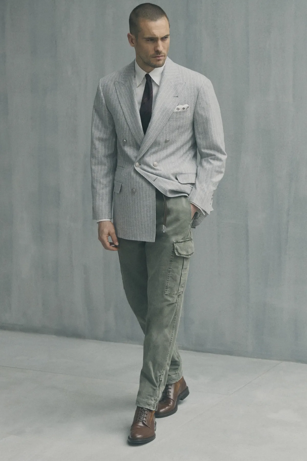 Les blazers croisés dominent la collection. Cucinelli est convaincu qu’une veste bien coupée confère de la prestance. Les épaules sont doucement structurées et la silhouette légèrement allongée. Le pantalon à taille haute et coupe large souligne une élégance rétro assumée. Face à cette rigueur de la coupe, les cargos en velours côtelé épais apportent une touche de fantaisie bienvenue.