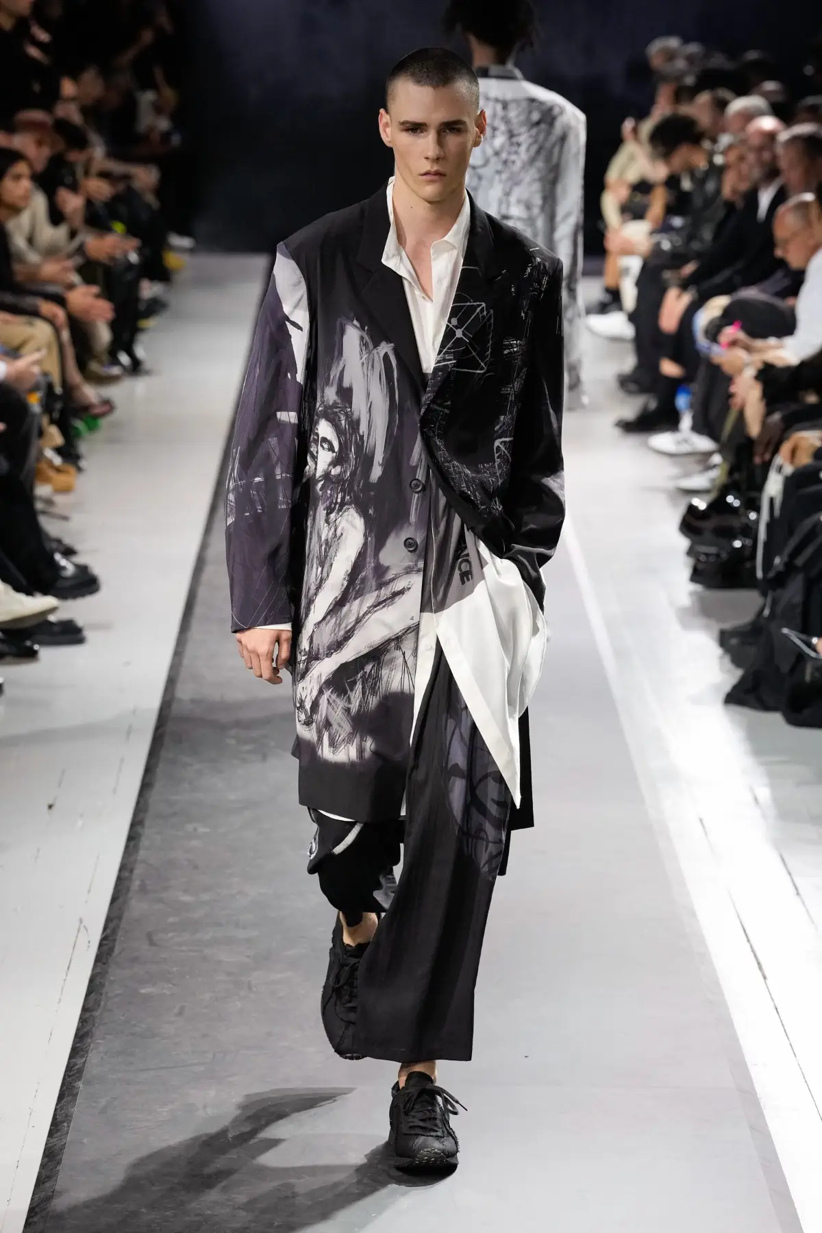 Inspiré par une nouvelle étude du bouddhisme et par un monde qu’il perçoit comme de plus en plus dangereux, Yamamoto a présenté une collection qui transcende le simple vêtement. Les silhouettes longues et superposées s’enchaînent sans effort, avec des T-shirts tombant en cascade sous le genou et des redingotes aux ourlets irréguliers et aux fermetures ajustables. Les pantalons amples et trois-quarts donnent une impression d’aisance, tandis que l’apparition de l’actrice Charlotte Rampling dans des pantalons surdimensionnés à bretelles ajoute une touche d’androgynie fantaisiste.