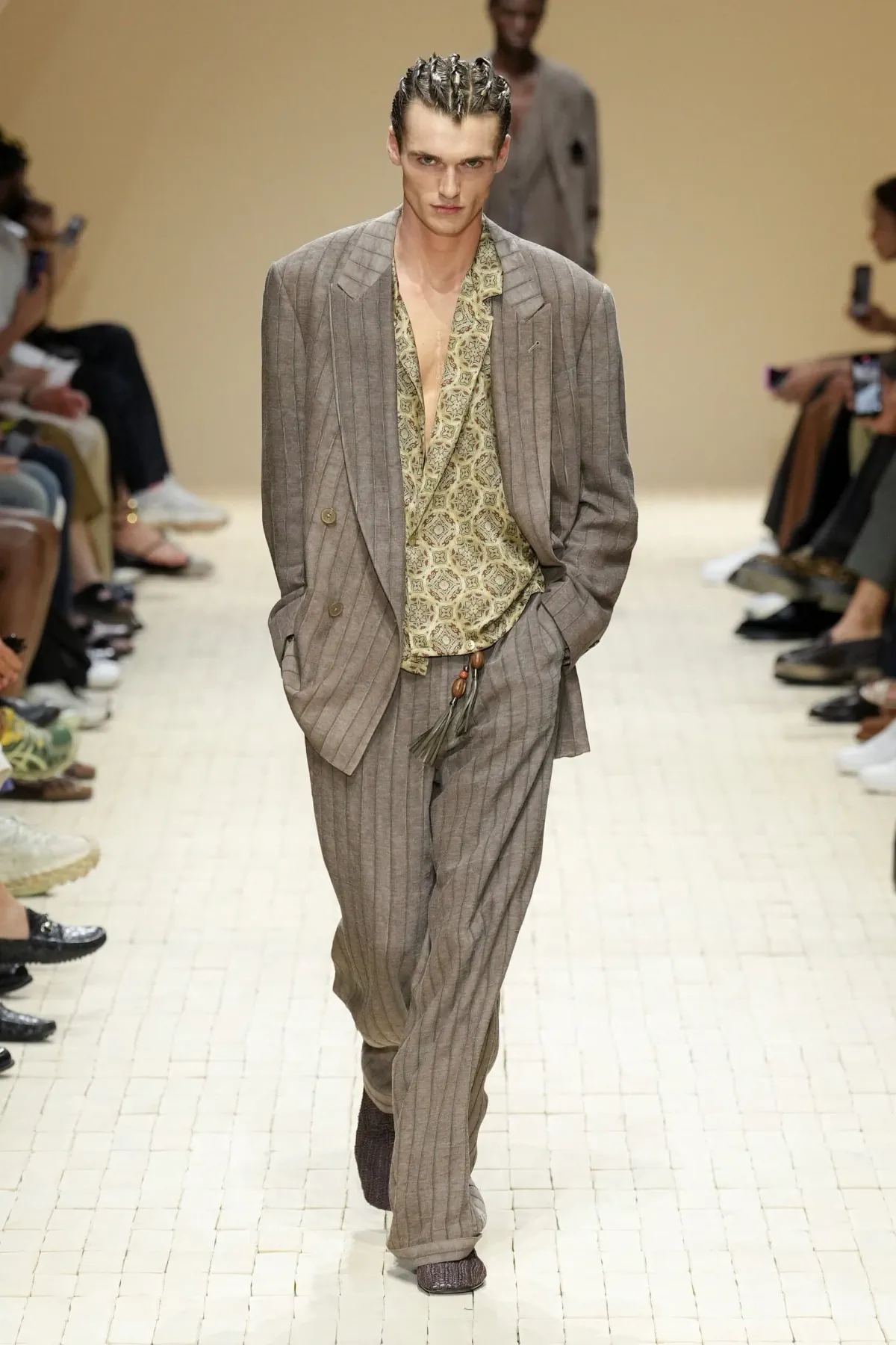 Les références aux traditions d’Afrique du Nord et d’Asie centrale créent une garde-robe véritablement globale. Entre les châles généreux et les manteaux en cuir olive, Armani prouve que l’exploration culturelle peut enrichir la mode masculine contemporaine.