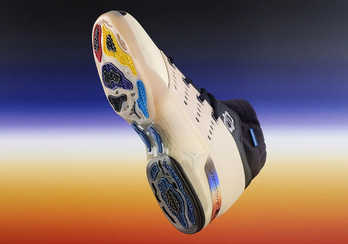 Le détail le plus marquant se trouve sur le renfort de talon chromé qui bénéficie d’un traitement irisé changeant de couleur selon la lumière. Cet effet se prolonge sous la semelle, où les motifs de traction en chevrons sont segmentés en plusieurs couleurs : rouge, jaune, violet, bleu et noir. D’autres modifications incluent des œillets en cuir perforé et une étiquette tissée avec la marque sur le haut du chausson intérieur. Une cage translucide en TPU sur la semelle intermédiaire laisse entrevoir l’unité Air, ajoutant une touche technique distinctive.