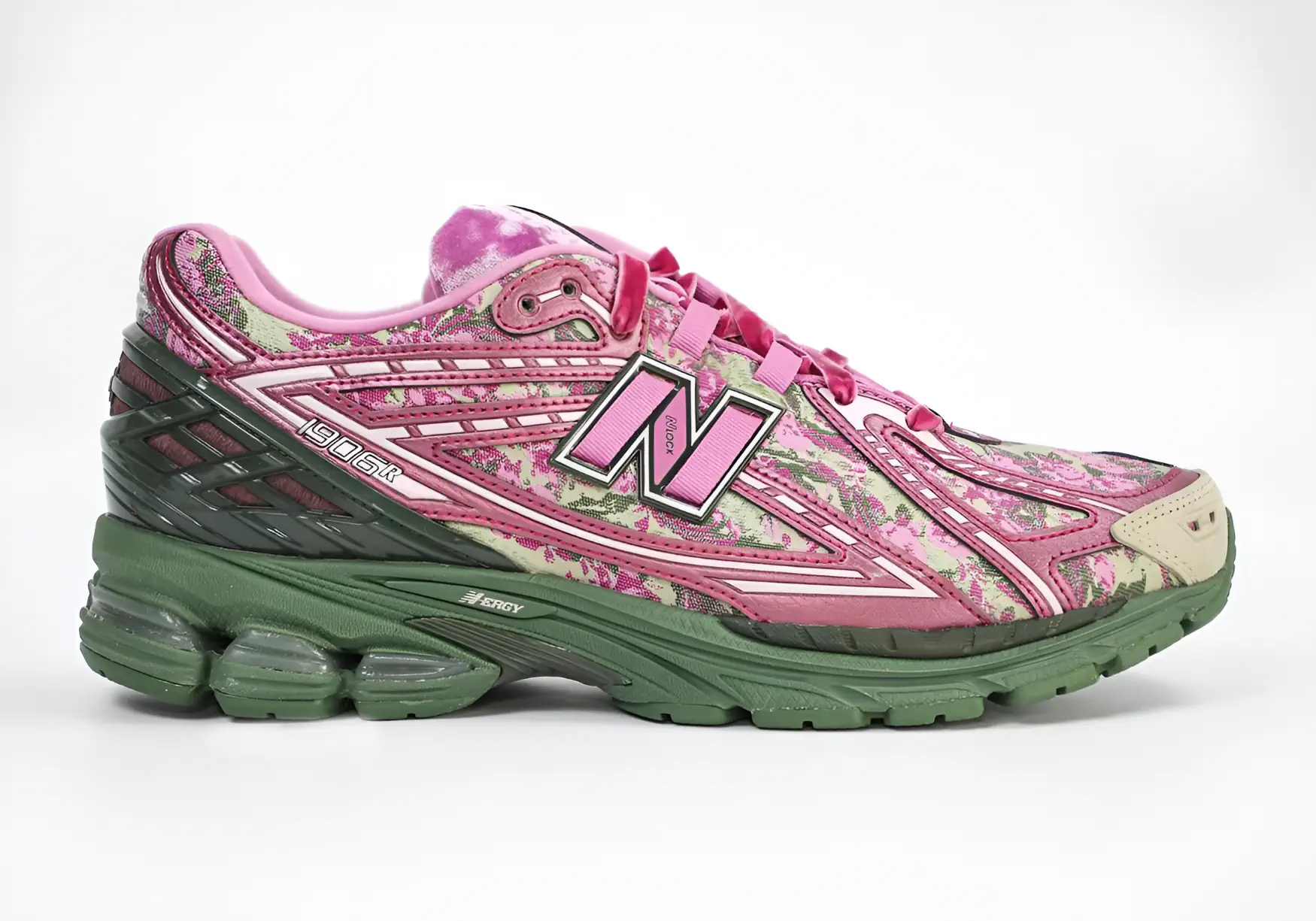 L’image teaser dévoilée par Harlow montre une version saisissante de la célèbre silhouette New Balance 1906R. La sneaker chunky présente une base ornée d’un motif floral rose vibrant, un choix de design unique qui a surpris et ravi les fans. Les superpositions en velours luxueux ajoutent une touche de luxe, tandis que l’esthétique générale évoque un sentiment de nostalgie, rappelant les meubles vintage ou peut-être même la maison d’une grand-mère bien-aimée.