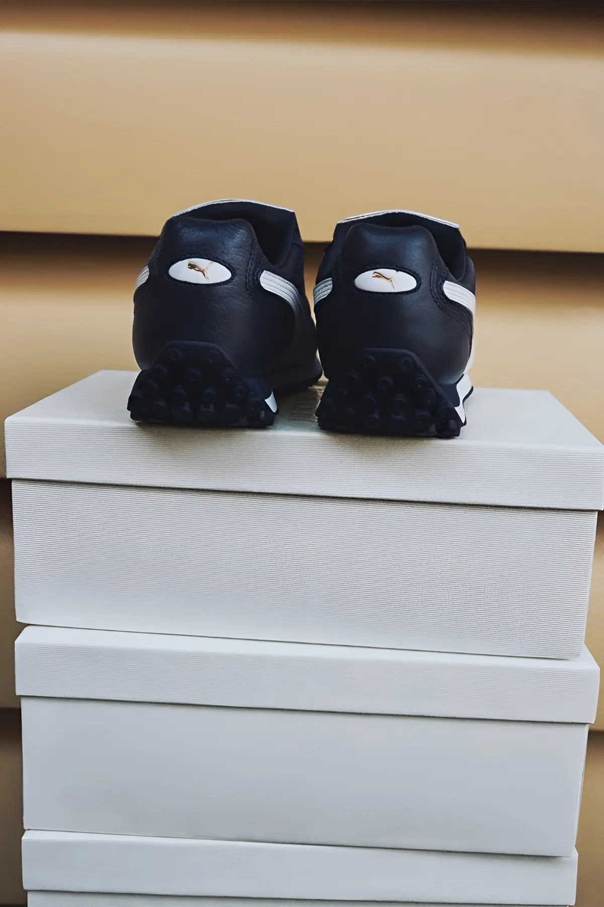 Son design se veut sobre et efficace. On y retrouve une tige en cuir bleu marine pour homme et femme, des lignes épurées rappelant l’ADN minimaliste de Jil Sander, ainsi que cette fameuse languette signature ornée du logo PUMA. Le nom de la marque allemande apparaît quant à lui sur le côté, gravé en dorure sur le cuir.
