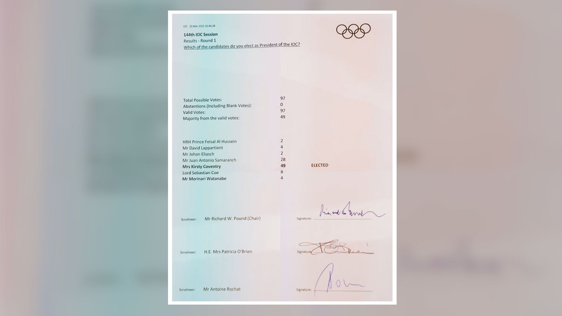Face à six autres candidats, Coventry s’est imposée avec 49 votes, devançant largement Juan Antonio Samaranch Jr. (28 voix) et Sebastian Coe (8 voix). Cette victoire nette illustre la forte adhésion des membres du CIO à sa candidature. Elle succèdera officiellement à Thomas Bach le 23 juin prochain, pour un mandat de huit ans.