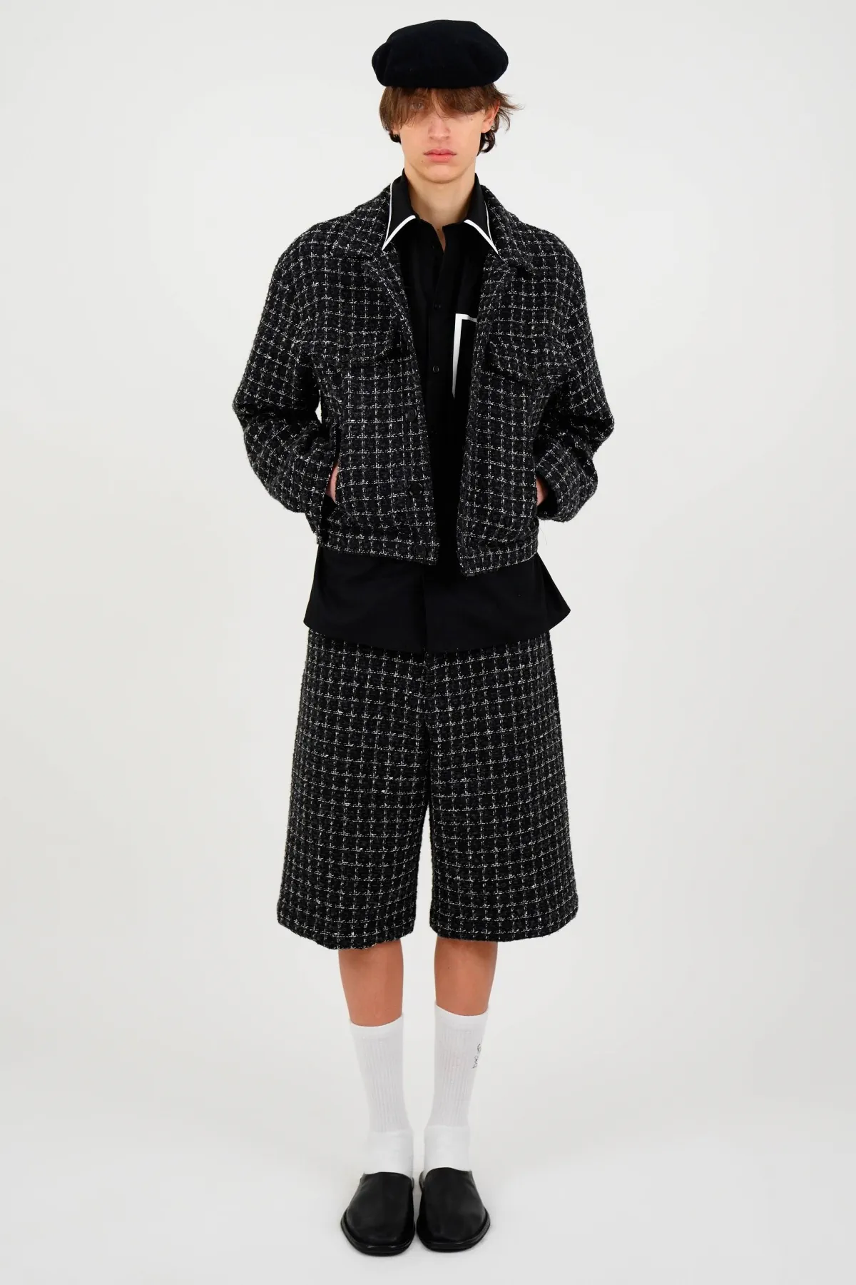Les argyles se répètent sur les pulls, les chaussettes et les cardigans. Cette prolifération du motif preppy par excellence n’est pas le fruit du hasard. Elle ancre fermement la collection dans un univers reconnaissable tout en lui donnant une cohérence visuelle immédiate. Giorgetti maîtrise l’art de la répétition contrôlée : suffisamment pour créer une identité, mais pas trop pour éviter la lassitude.