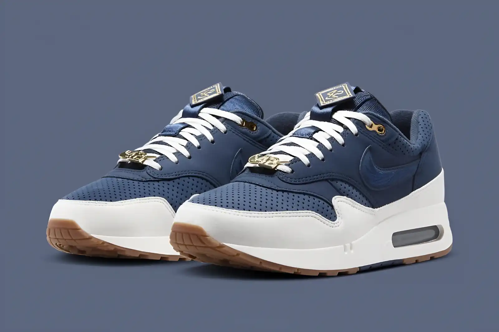 La Nike Air Max 1 ’86 “Jackie Robinson” bénéficie d’une construction haut de gamme qui allie harmonieusement style et référence historique. L’empeigne est fabriquée en daim bleu marine luxueux, évoquant un sentiment de sophistication et d’élégance intemporelle. Des accents de noir obsidien et de blanc marine ajoutent de la profondeur et de la dimension au design, tandis que des accents métalliques dorés apparaissent sur les lacets et les œillets, offrant une touche de luxe discret. Une semelle extérieure en gomme marron clair complète le look, offrant un clin d’œil subtil à l’époque de Robinson et à la riche histoire du jeu.