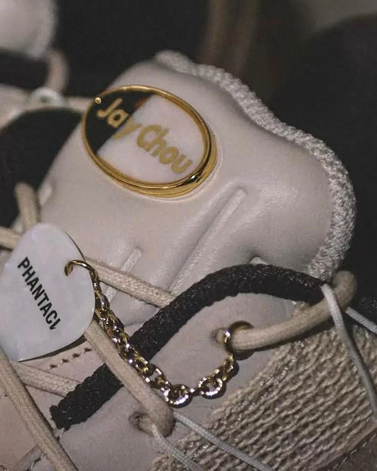 Les clichés partagés par l’artiste lui-même offrent un aperçu d’une conception soignée. L’accessoire le plus visible est un médiator de guitare estampillé PHANTACI, attaché aux lacets par une fine chaîne argentée. Cet élément fait écho au logo de Jay Chou, visible sur la languette et présentant une finition écaille de tortue sombre, rappelant ainsi l’emblème original du modèle de 1995.