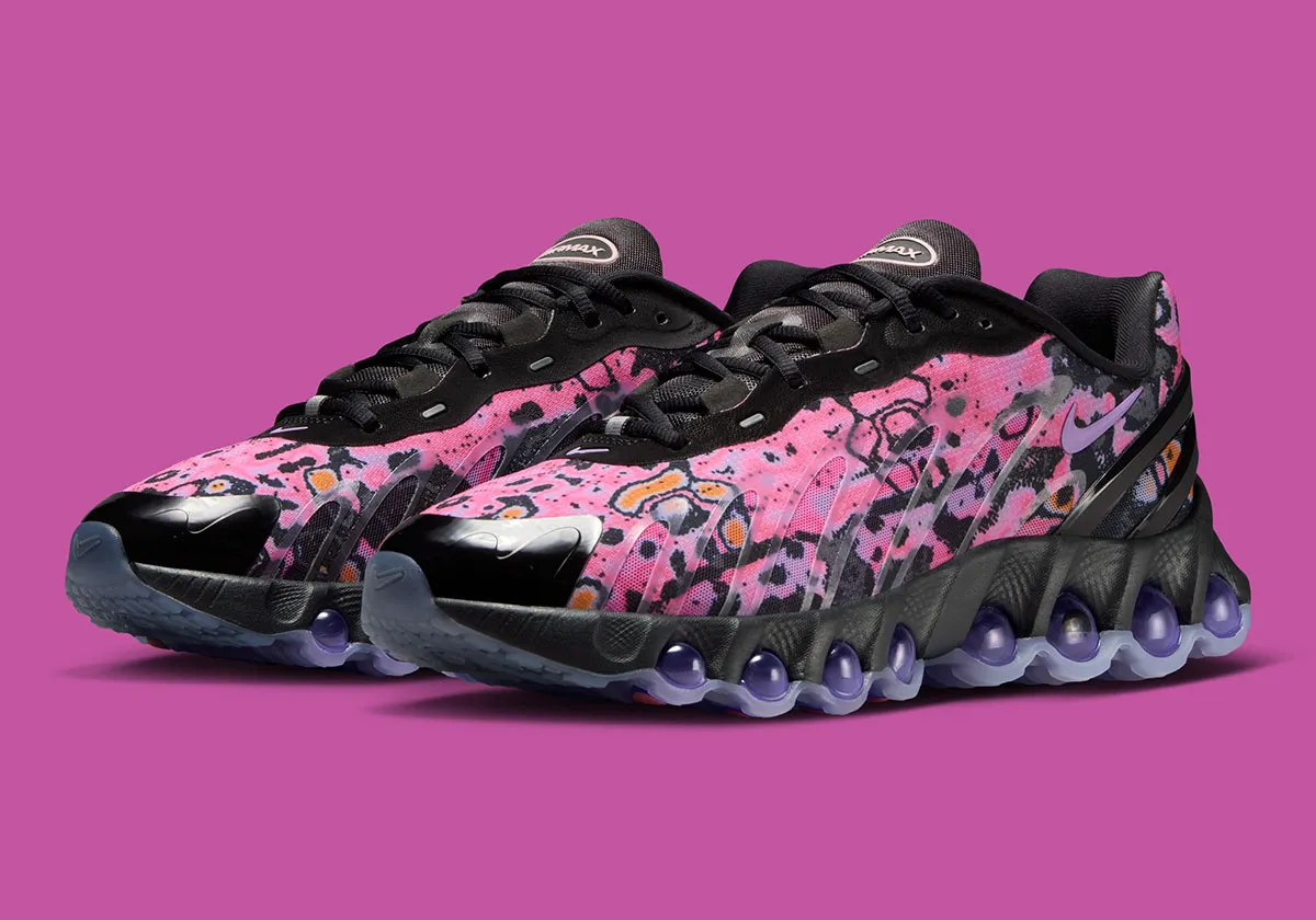 Concrètement, la paire se distingue par plusieurs détails. Sur le talon, le logo « Dn » traditionnel a laissé place au célèbre smiley légèrement penché, celui qu’on associe immédiatement à ce salut joyeux. Ce visage souriant est décliné dans des teintes violettes, une couleur que l’on retrouve également sur les huit chambres d’air Dynamic Air visibles sous la semelle, l’une des caractéristiques techniques les plus marquantes de ce modèle. Le reste de la chaussure présente un arrangement de textures qui évoque à la fois une cartographie thermique et un motif peau de serpent, dans des tons violets sombres. Des finitions noires viennent encadrer l’ensemble et lui donner une certaine cohérence.