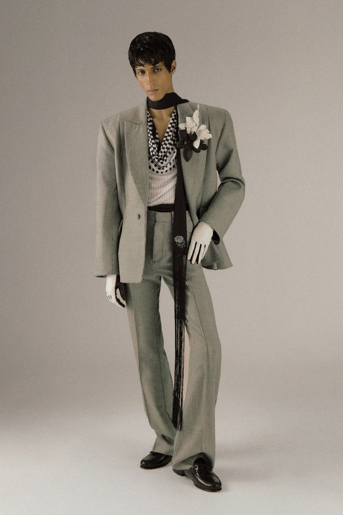 Les looks 21 et 24 de la collection méritent une attention particulière. Palomo y explore l’échange de pièces entre les genres : elle porte ce qui était pensé pour lui et il endosse ce qui était destiné à elle. Le résultat est saisissant. Elle paraît décontractée, lui prend une dimension sculpturale. C’est dans ces moments que la griffe révèle ce qu’elle a toujours eu de plus précieux : sa capacité à réinventer le masculin sans le dénaturer ni le fragiliser.