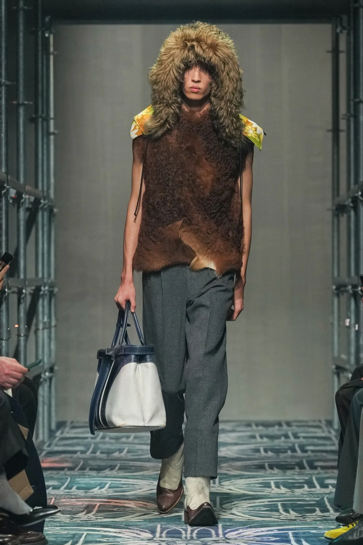 La collection elle-même était un patchwork d’influences, puisant son inspiration dans l’esthétique des friperies, les nappes vintage et les références cinématographiques, des westerns spaghettis aux œuvres surréalistes de David Lynch. Des cols en peau de mouton, des T-shirts rétrécis ornés de fleurs et de motifs écossais, des sacs de bowling en cuir usés par le temps coexistent avec des manteaux en laine impeccablement taillés et de somptueux blazers en daim. La juxtaposition de bottes de cow-boy éraflées et de pièces de charité froissées avec des vêtements haut de gamme souligne l’engagement de Prada à redéfinir le luxe dans un monde de plus en plus dominé par l’intelligence artificielle et les tendances conservatrices.