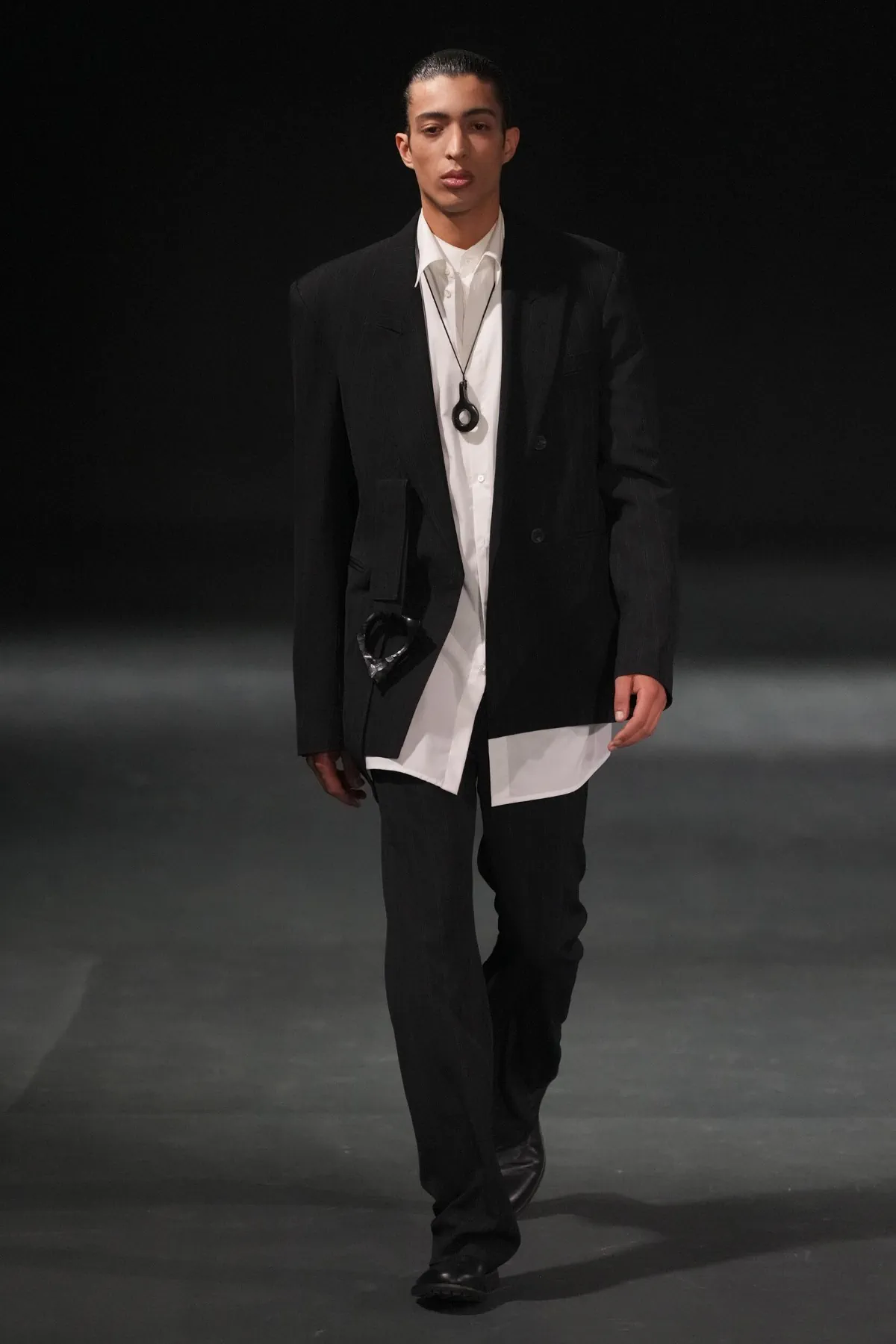 Le premier passage donne le ton. Un costume à fines rayures, porté avec une chemise blanche basique et des mocassins plats. Rien de spectaculaire. Puis, tout bascule. Les codes archétypaux du vestiaire masculin se fragmentent, se superposent et prennent du volume. Le tailleur classique devient support de mémoire.