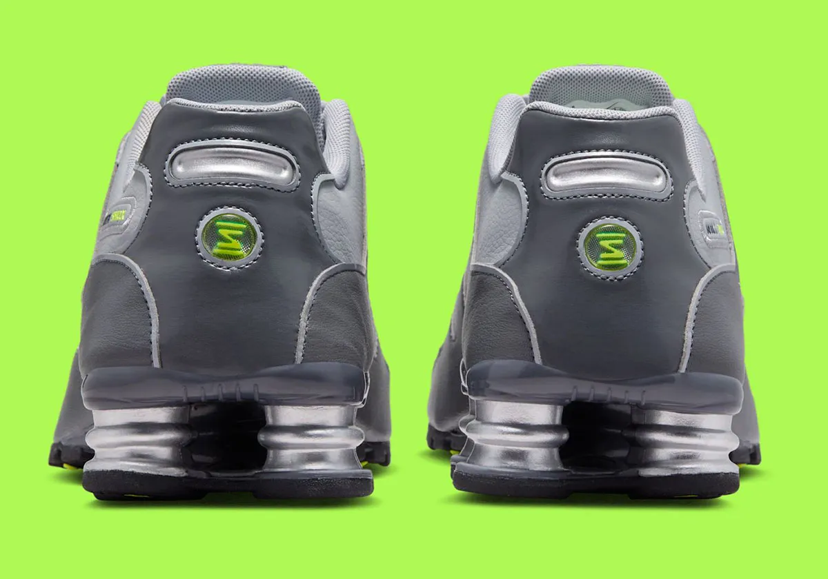 La touche de volt dynamise l’ensemble sur les semelles intérieures, la languette et les éléments de branding. Cette teinte fluo, caractéristique des années 2000, rappelle inévitablement la Air Max 95 Neon, une référence incontournable de l’époque. Les colonnes Shox au talon sont dotées d’une finition argentée métallique, tandis que la semelle extérieure reste noire.