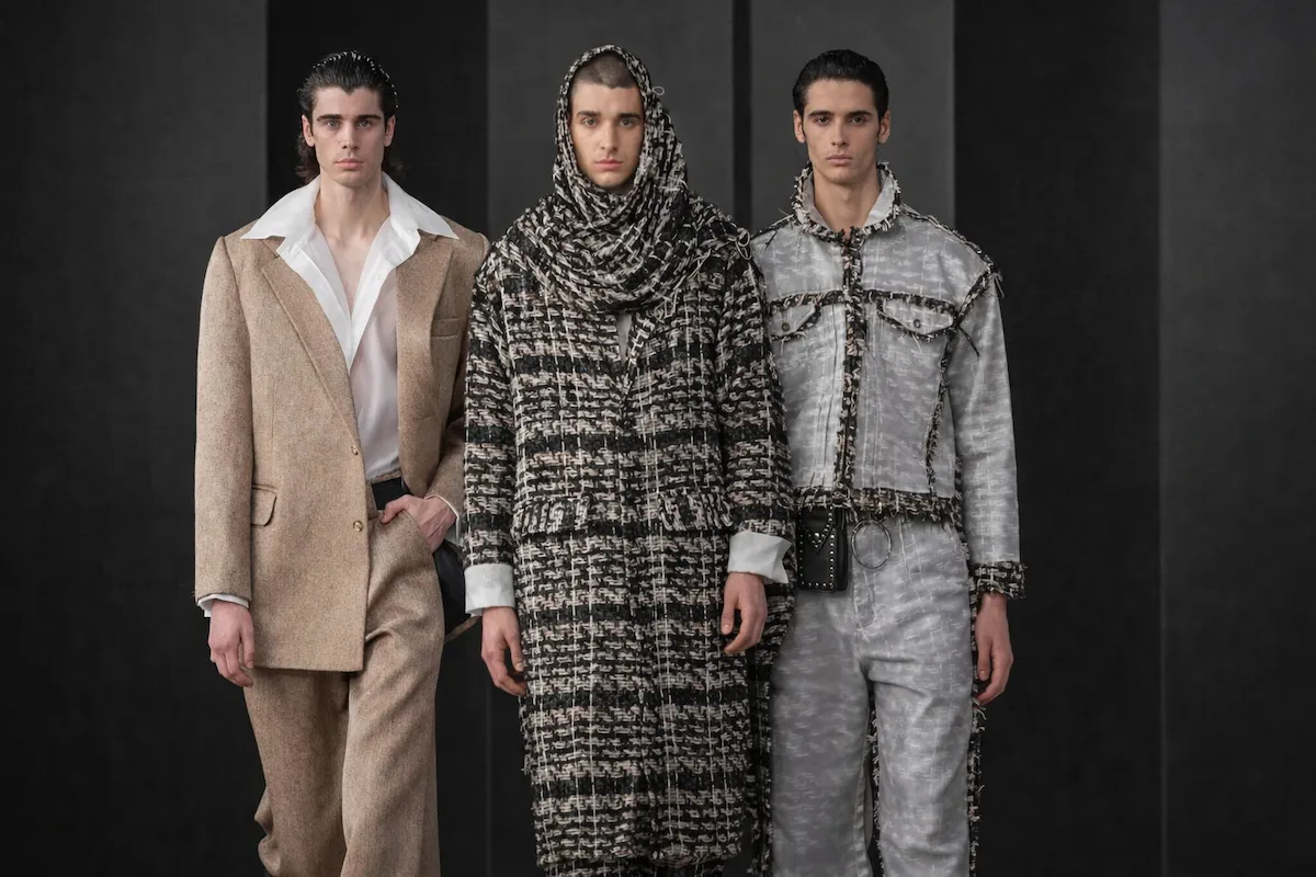 L’une des propositions les plus frappantes du défilé était ce costume taillé dans un velours dense, presque aussi épais qu’un tapis, et teint d’un or profond. Le même tissu a servi de point de départ à une nouvelle version des pièces en cuir tressé, désormais la signature reconnaissable du créateur. Sous les vestes, des chemises en mousseline opaque ajoutaient une légèreté sensorielle à l’ensemble, un contraste qui fonctionne sans qu’on cherche à l’expliquer.